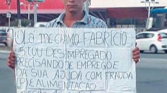 Fabrício Geovane Vieira dos Santos, de 22 anos, é casado há cinco com Ericássia, e tem dois filhos, de 5 e 3 anos. Desempregado há 36 meses, ele decidiu improvisar uma placa na tentativa de conseguir um trabalho com carteira assinada.