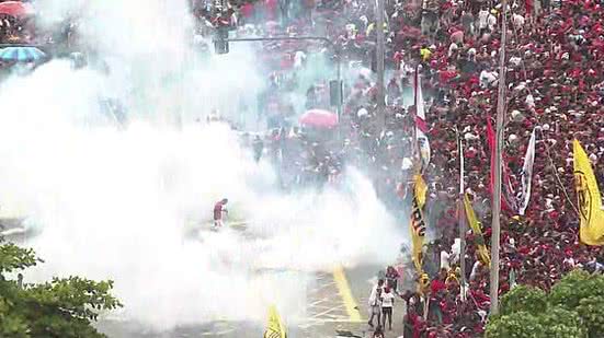 Bombas de gás para dispersar a multidão foram atiradas após o trio elétrico que levava o time do Flamengo deixar a Avenida Presidente Vargas, na altura do monumento a Zumbi dos Palmares.