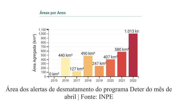 Dados do sistema Deter, do Instituto de Pesquisas Espaciais (Inpe), divulgados nesta sexta-feira (6/5), mostram aumento assustador do desmatamento na Amazônia, que segue desenfreado e alcançou níveis alarmantes, batendo novos recordes, de acordo com o Greenpeace Brasil.Conforme dados do Inpe, entre os dias 1º e 29 de abril, os alertas apontam para um total de 1.013 km² de áreas desmatadas, dado 74,6% superior ao registrado no mesmo mês de 2021. É o pior resultado da série histórica, iniciada em 2004, quando foi criado o Deter.