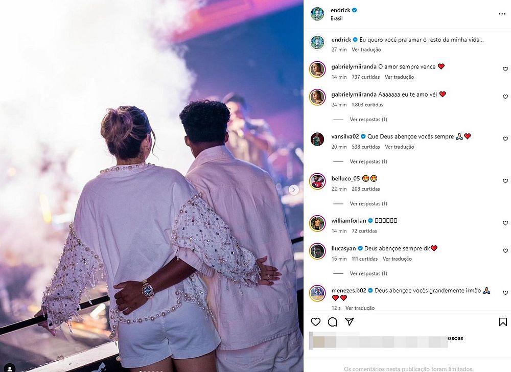 "Eu quero você pra amar o resto da minha vida", escreveu o atleta de 17 anos. Grabiely comentou a publicação de Endrick e disse que "o amor sempre vence".