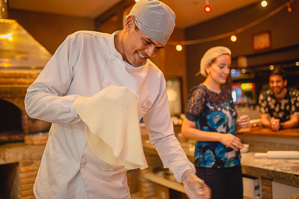 Erisvaldo da Silva é pizzaiolo da Sabatelli da Ponta Verde há cinco anos. Ele começou com serviços gerais, depois se tornou forneiro, pizzaolo e, atualmente, é chefe do setor. “Sabatelli foi minha escola”, conta o alagoano, enquanto ensinava a 12 aprendizes como moldar a massa redonda no evento “Pizzômetro” organizado pela 2. Refresh. Eu estava entre seus alunos.
