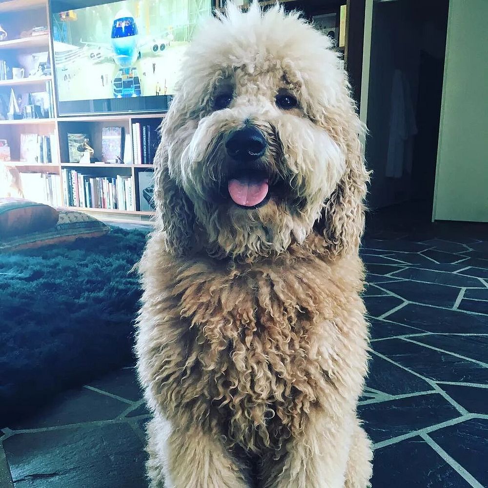 Adam Levine, vocalista da banda Maroon 5, é tutor de Bones, um golden doodle que entrou para sua família em 2013.