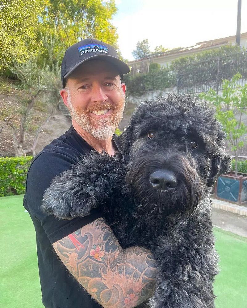 O baixista da banda Linkin Park recentemente adotou Tank, um boiadeiro de flandres - um cachorro muito inteligente de origem parte belga, parte francesa.