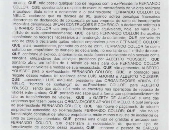 "A operação para o resgate desses valores foi realizada entre Luís Amorim e Alberto Youssef; que apresentou Luís Amorim, presidente das Organizações Arnon de Mello (grupo responsável pela TV Gazeta e outros veículos de comunicação, pertencente a Fernando Collor) "homem de confiança" do ex-presidente Collor, para Alberto Youssef, sendo que após não mais se envolveu nas operações de repasse de valores entre ambos", disse Pedro Paulo.