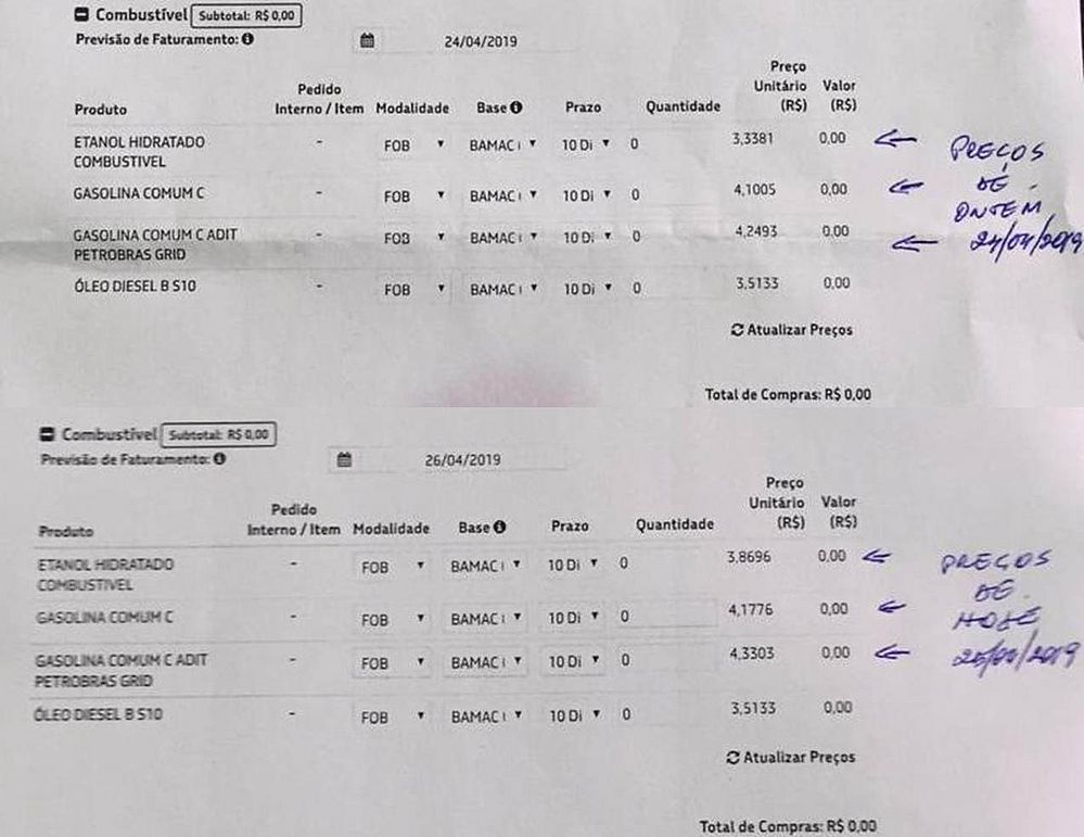 De acordo com documentos enviado por um proprietário de posto, que não quer ser identificado, a gasolina comum foi reajustada em R$ 0,07, a aditivada em R$ 0,09 e o álcool hidratado em R$ 0,53. Com esses reajustes, os preços na distribuidora atingiram as casas de R$ 3,86 para o álcool, e R$ 4,17 para gasolina comum e R$ 4,33 para gasolina aditivada.