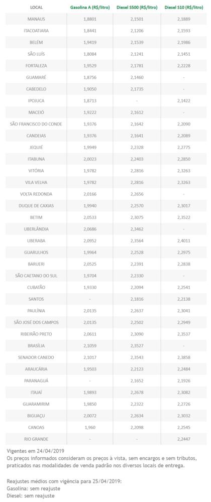 Confira as tabelas com os preços praticados pela distribuidora ontem e hoje:
