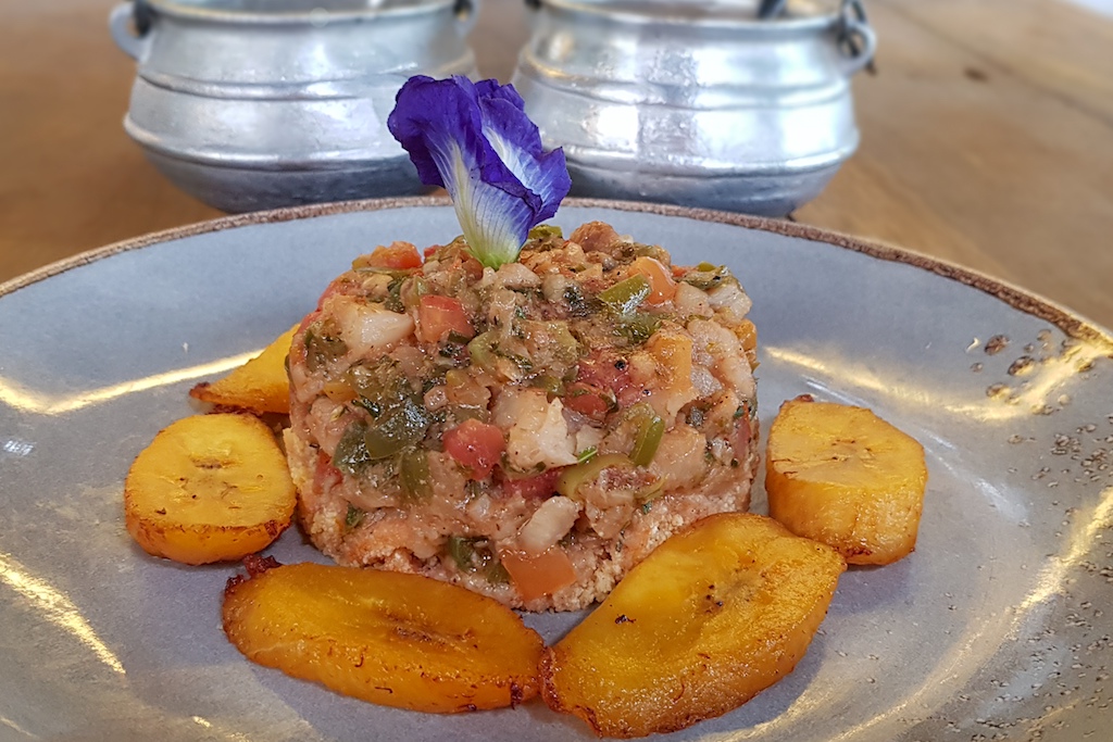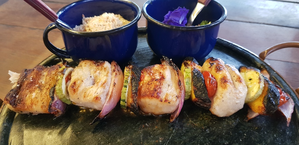 Espetinho de pirarucu com legumes, banana da terra, temperado no limão e sal grosso