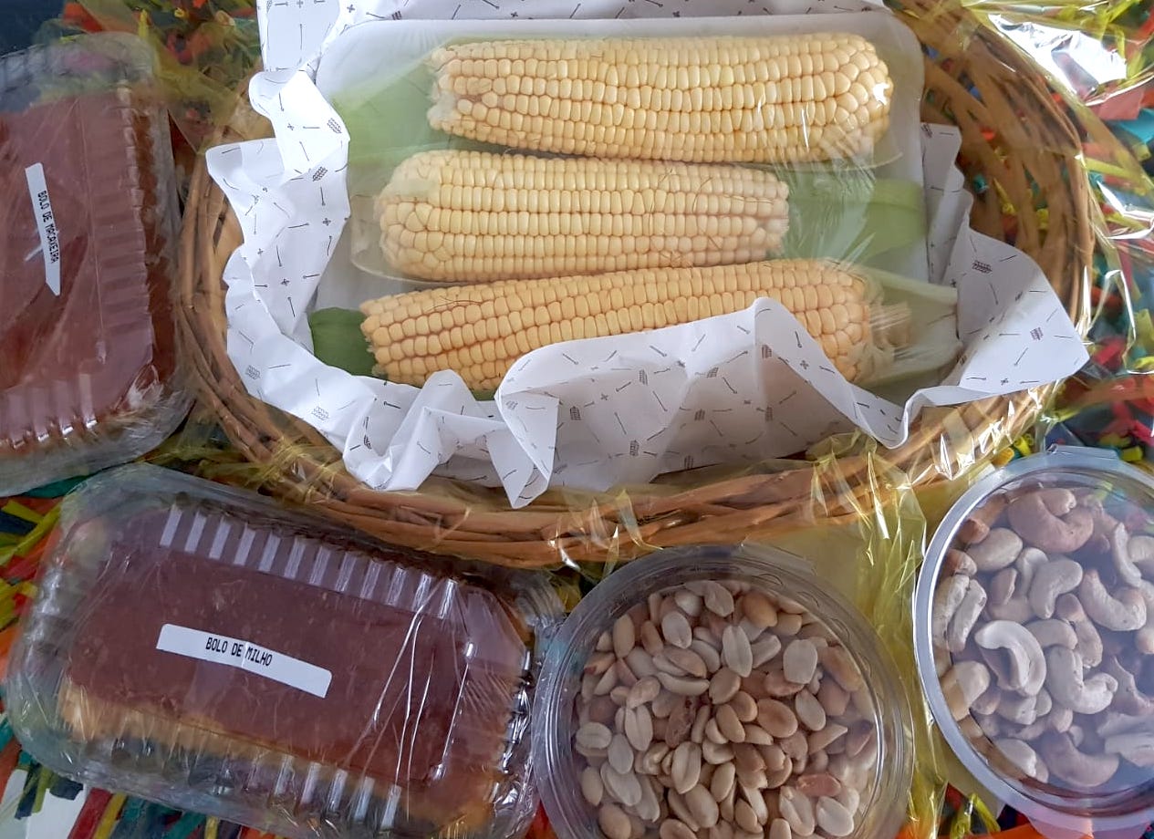 Canjica, pamonha, milho verde cozido, amendoim, bolos de macaxeira, de milho e de mandioca, e ainda tem milho verde pra fazer em casa. Este São João em casa não vai faltar forrobodó de comidinhas.