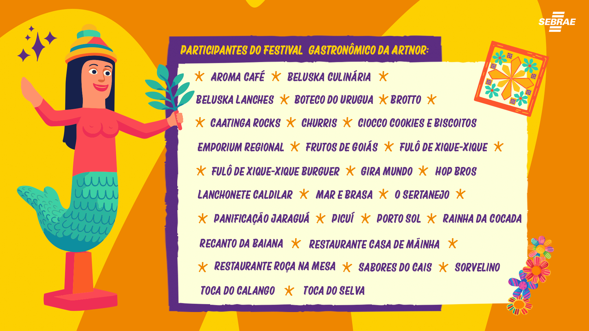 Ao todo, 28 estabelecimentos participam do festival. Destes, 14 estão no Mercado das Artes e outros 14 espalhados pelo bairro, formando um circuito que vai de chefs reconhecidos, como Wanderson Medeiros, do tradicional Picuí, até personagens queridos da cena popular, como Seu Moacir, da Lanchonete Caldilar.