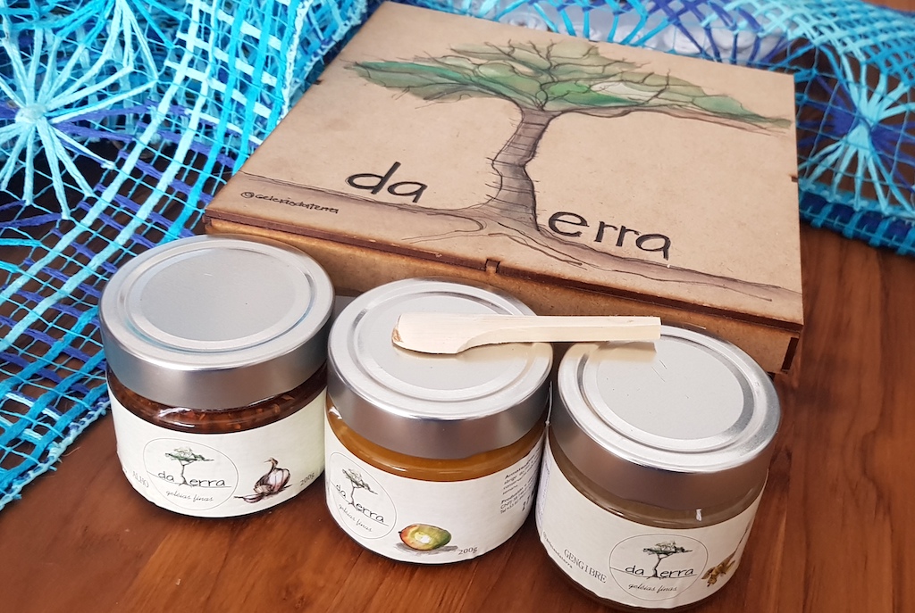 As Geleias da Terra têm nos sabores de pimenta, alho, laranja com pimenta calabresa, gengibre e manga. Provei todas, a minha predileta é a de laranja, seguida pelo sabor de manga, mas a de alho na companhia do salaminho surpreendeu o meu paladar, deu um tom de elegância ao alho. A proposta de Henrique é valorizar as frutas de cada época, e em breve vão surgir as de caju, cajá, pitanga, jambo, entre diversas outras frutas da reserva ecológica Tobogã.