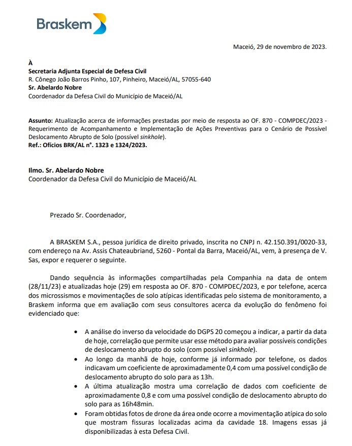 O TNH1 obteve o documento enviado pela Braskem, nesta quarta-feira, 29, às autoridades municipais, como a Defesa Civil de Maceió, informando que uma possível condição de deslocamento abrupto do solo para as 16h48. A mina 18, localizada próxima ao antigo CT do CSA, no Mutange, está em risco de colapso e a área foi isolada.