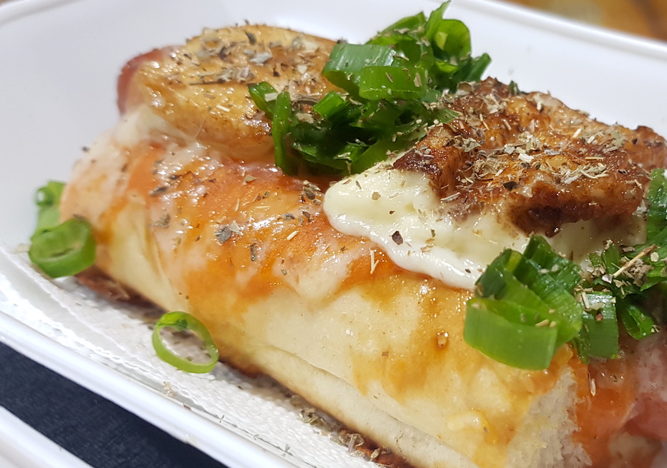 Detalhe de hot dog com molho de pizza e queijo coalho