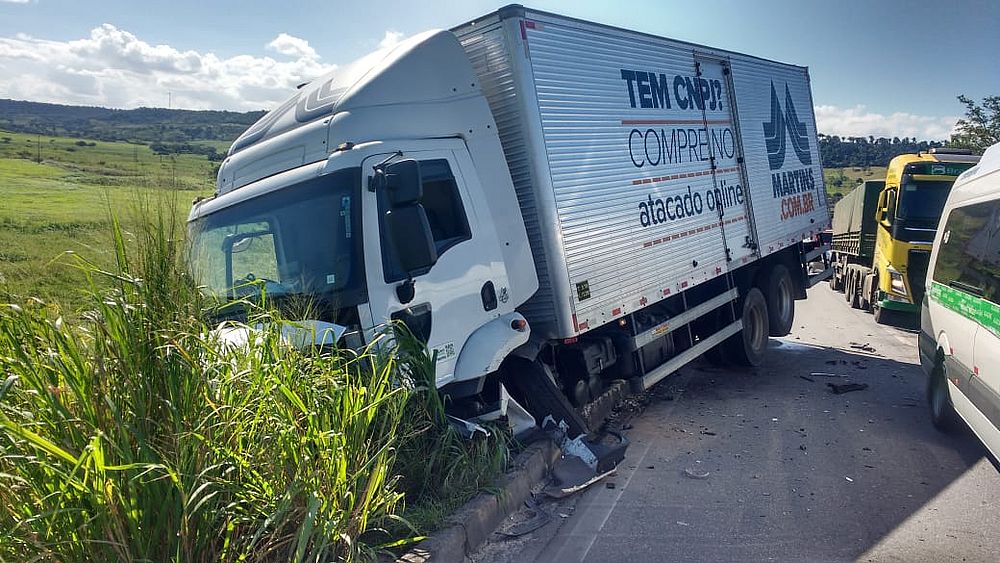 O caminhão, de placa QNK-2548, de Uberlândia-MG, pertence a uma loja de rede atacadista. Com o impacto, só parou numa área de mata às margens da rodovia. A cabine do veículo ficou danificada, mas o motorista nada sofreu.