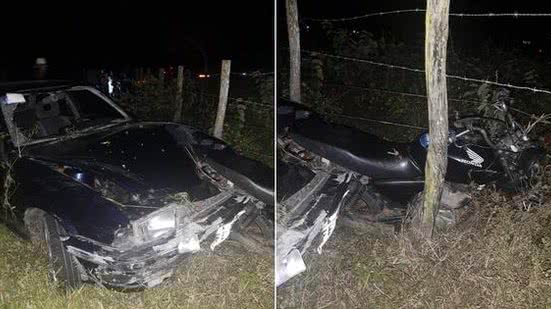A colisão provocou a saída de pista do veículo de duas rodas, que parou numa cerca com arames. O carro ficou com a parte da frente destruída e com vidro quebrado.
