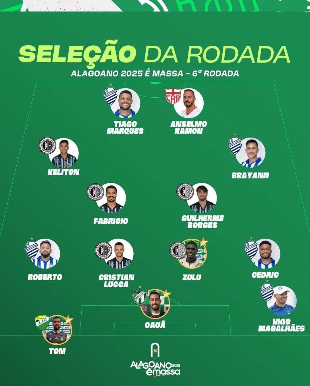 A Federação Alagoana de Futebol (FAF) divulgou a seleção dos melhores jogadores da sexta rodada nessa segunda-feira (03). A seleção foi especial e tem um jogador a mais, além do domínio dos atletas do CSA e ASA, que empataram em 0 a 0 no jogo desse sábado (04). A eleição é realizada com dez jornalistas das emissoras oficiais da competição.