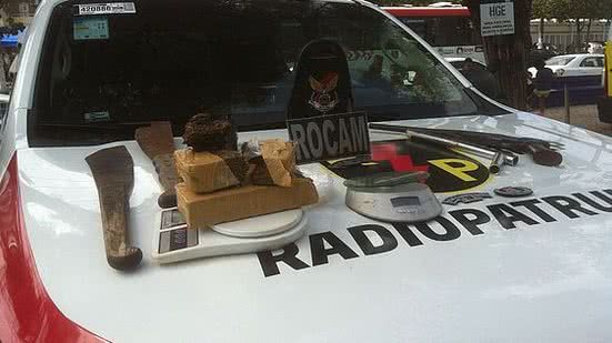 Foram apreendidos um tablete e meio de maconha, duas armas de fogo, uma de calibre 38 e outra de calibre não divulgado, e duas balanças de precisão.