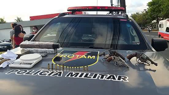 Os militares fizeram a abordagem e deram ordem para que os suspeitos estacionassem o veículo. Durante a revista, os policiais encontraram dois tabletes grandes de maconha, além de três revólveres de calibres 38, 32, e 22, todos municiados. A droga estava escondida dentro das caixas de som do veículo, e as armas, sob os bancos.