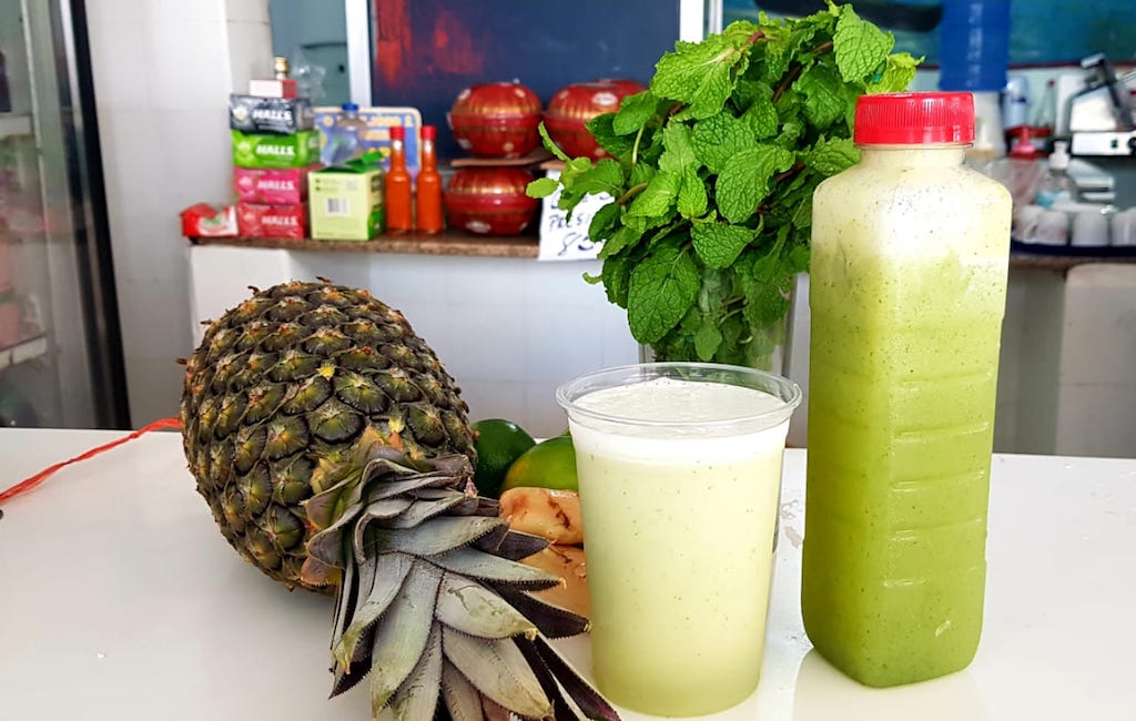 No suco 10 em 1, cabe no copo do liquidificador: suco de laranja, acerola, banana, limão, beterraba, cenoura, guaraná em pó, hortelã, goiaba, abacaxi, maçã, uva e gengibre. Na verdade são mais de 10, não leva água e açúcar, só se o freguês quiser. O resultado final são dois copos de felicidade por R$ 8, porque o copo do liquidificador vai pra mesa.