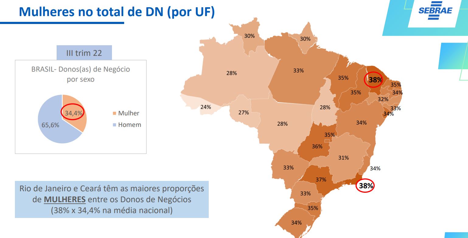 No ano passado atingiu-se o recorde de mulheres donas de negócios: mais de 10 milhões de empreendedoras, contra quase 20 mil homens. Segundo o Sebrae, no Brasil são 34,4% de empreendedoras mulheres contra 65,6% de homens.