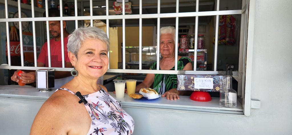 Suco de mangaba é a melhor lembrança da minha infância no bairro de Mangabeiras, cujo nome já remetia à abundância dos pés de mangaba, fruta pequena, amarelada com manchinhas, com leve grude no final. Eu amo comer e tomar suco dessa frutinha, e quando quero lembrar desse sabor sigo até a lanchonete de Dona Geo, na Avenida Walter Ananias, 893 -Jaraguá. Não tem placa, mas todo mundo acha com facilidade, fica de frente à linha do trem, próximo ao Centro de Convenções e sede da Policia Federal. Geo é o apelido carinhoso de dona Gertrudes Wanderlei Araújo, aposentada pelos Correios, que aos 92 segue lindamente distribuindo sorrisos. E atém dos sucos naturais, tem pasteis, sanduíches e coxinhas.