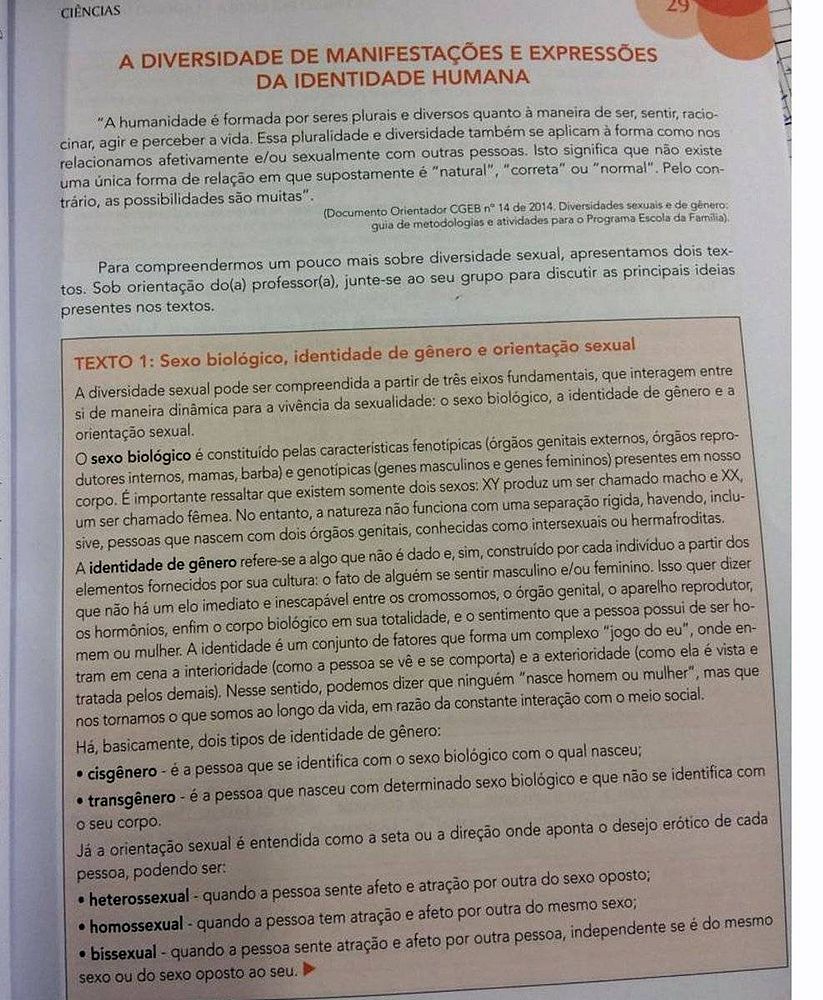Na página em questão, um quadro explica a diferença entre sexo biológico – constituído pelas características fenotípicas, como órgãos genitais, e genotípicas, como genes – e identidade de gênero – como cada pessoa se identifica a partir de elementos culturais. Os dois são diferenciados, ainda, da orientação sexual – que define o desejo erótico de cada pessoa, como heterossexualidade e homossexualidade.