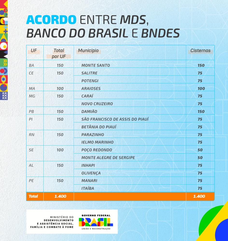 Ao todo, serão investidos pelo Governo Federal R$ 46,44 milhões, sendo R$ 40 milhões para a implementação das cisternas com recursos das instituições bancárias, e R$ 6,44 milhões via MDS pelo Fomento Rural. O chamamento público para as entidades da sociedade civil interessadas em participar do processo será aberto em agosto.