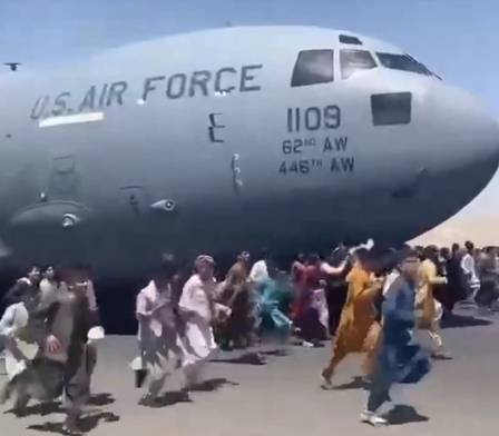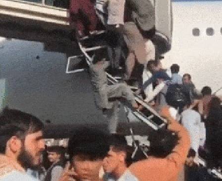 Imagens mostram afegãos correndo ao lado do transporte do C-17 enquanto ele se prepara para decolar com cerca de uma dúzia segurando o compartimento das rodas. Helicópteros americanos Apache foram trazidos para abrir caminho para os aviões de transporte, voando baixo para dispersar as pessoas aglomeradas na pista. Pessoas desesperadas também foram filmadas tentando subir uma escada para entrar em um avião, enquanto outras eram vistas sendo puxadas para bordo de outra aeronave.