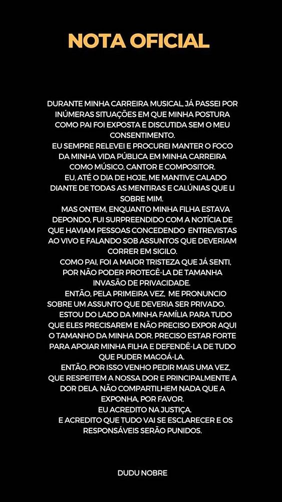 O cantor Dudu Nobre publicou nota em suas redes sociais nesta quarta-feira (11) repudiando pessoas que estariam dando entrevistas sobre o caso de sua filha Olívia, que foi vítima de abuso no domingo (8), e cuja investigação está sendo feita pela Polícia Civil sob sigilo.