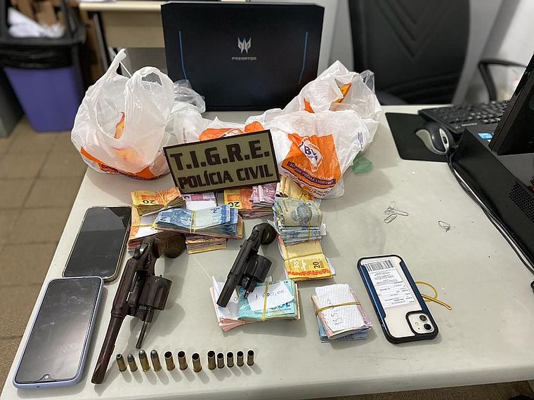 Os policiais prenderam a dupla e retornaram ao terreno baldio, onde localizaram a bolsa que tinha sido arremessada. Nela, havia duas armas de fogo, que estavam com munições, R$ 6.500 em dinheiro, celulares, notebook e diversos documentos.