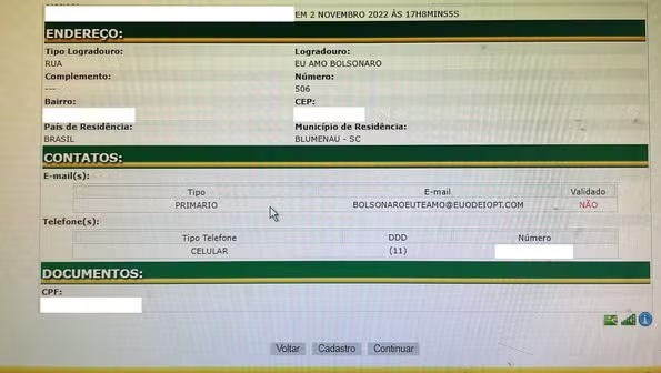 No mesmo registro, ainda é possível observar alterações de cunho político. O nome do pai dela foi alterado para "Morto pelo PT”, o endereço destacado como "Eu amo Bolsonaro" e o e-mail inserido como “[email protected]”.