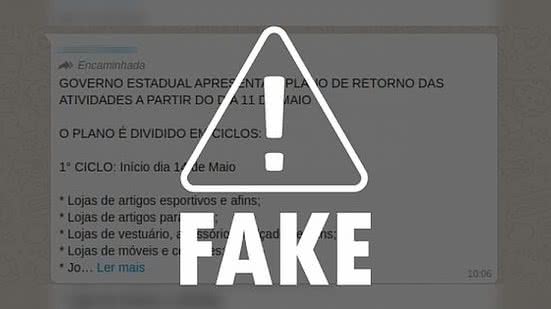 "Governo Estadual apresenta o plano de retorno das atividades a partir do dia 11 de maio. O plano é dividido em ciclos: 1° ciclo: Início dia 14 de Maio. Lojas de artigos esportivos e afins; Lojas de artigos para casa; Lojas de vestuário, acessórios, calçados e afins; Lojas de móveis e colchões; Joalherias e relojoarias", diz trecho da mensagem.