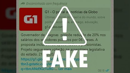 Diz a mensagem falsa: “Governador de Alagoas propõe redução de 20% nos salários dos servidores públicos por 06 meses. A proposta inclui ativos, aposentados e pensionistas. Projeto segue para votação na assembleia legislativa do estado. 21/02/2021. Não basta o desconto dos 14% da Previdência?”