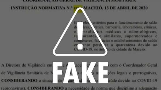 O documento, divulgado como oficial, falsamente informa que para o retorno das atividades nos estabelecimentos comerciais acima elencados, algumas regras teriam que ser seguidas pelos empresários, como atendimento a um cliente por vez, a proibição de filas nesse ambientes e o uso de equipamentos de proteção dos funcionários. “Instrução Normativa Nºxxxx Maceió, 13 de Abril de 2020. Estabelece critério para o funcionamento de salão de beleza, estética, barbearia, laboratórios, clínicas e consultórios médicos e odontológicos, restaurantes e similares (...) enquanto perdurar a quarentena”, diz um trecho do texto. As informações são falsas.