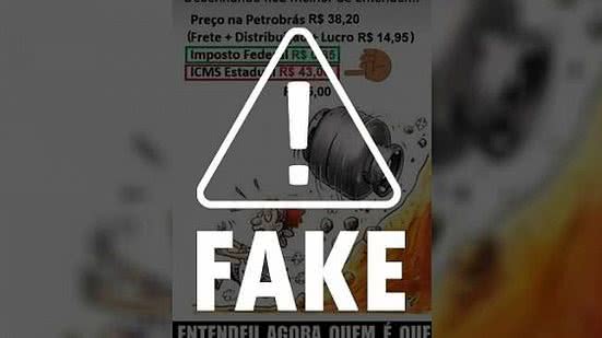 A mensagem compartilhada apresenta vários erros e não cita a fonte das informações. “Preço na Petrobrás RS 38,20, frete + distribuição + lucro R$ 14,95, imposto federal R$ 0,85, ICMS estadual R$ 43,00, [valor total:] R$ 95,00 (sic)”, informa a imagem com uma charge. “Entendeu agora quem é que está te roubando?”, questiona ao tentar responsabilizar os governos estaduais pelo preço do produto.