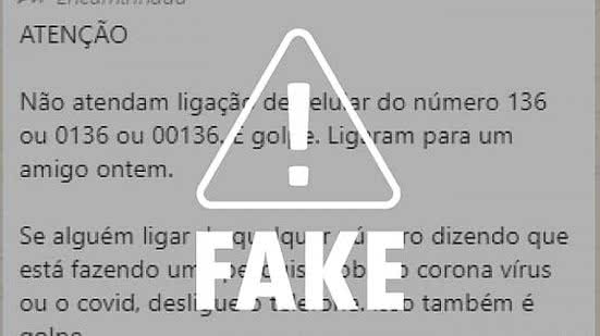 Em tom de alerta, o texto das redes sociais explica que as pessoas não devem atender às ligações dos números 136, 0136 ou 00136 para não ser enganadas. "Não atendam ligação de celular do número 136 ou 0136 ou 00136. É golpe. Ligaram para um amigo ontem. Se alguém ligar de qualquer número dizendo que está fazendo uma pesquisa sobre o coronavírus ou o Covid, desligue o telefone. Isso também é golpe", diz a mensagem.