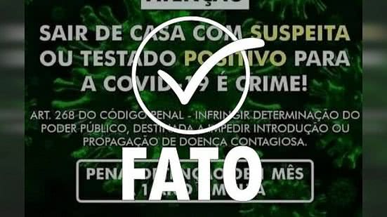 Circula em grupos de WhatsApp uma imagem afirmando que pessoas que sejam casos confirmados ou suspeitos de coronavírus e insistirem em sair de suas casas estarão cometendo crime passível de prisão. A informação é verdadeira.