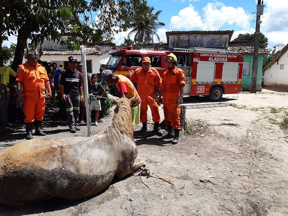 Uma égua que havia caído em um poço com três metros de profundidade, na Rua São Paulo, na Zona Rural do município de Porto Calvo, no interior de Alagoas, foi resgatada com vida por uma equipe do Corpo de Bombeiros, nesta quinta-feira (02).