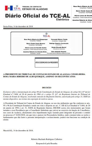 Porém, em ato publicado em edição do Diário Oficial Eletrônico do TCE desta sexta-feira, a presidente do Tribunal de Contas invocou os artigos 96 e 97 da Constituição Estadual e decidiu acatar o pedido do conselheiro Anselmo Brito. "A Presidente do Tribunal de Contas do Estado de Alagoas, no uso das atribuições que lhe conferem os arts. 95 e 96 da Constituição Estadual e tendo em vista o disposto no art. 1º, XII da Lei Estadual nº 5.604, de 20 de janeiro de 1994 e art. 31, XXIX do Regimento Interno, DECIDE acerca dos memorandos que foram instados a essa Presidência que o Conselheiro Substituto que estiver no exercício da função de Conselheiro, nos casos de vacância, afastamento e/ou impedimento legal, fazendo parte integrante da presente o contido no processo nº 16381/2018, em que tem o parecer da Procuradoria Jurídica, onde constam todas as razões e fundamentos que dão lastro a presente interpretação e esclarecimento, poderá sim funcionar na condição de eleitor", diz o texto.
