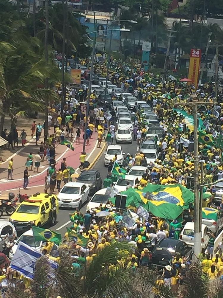 Com o apoio de um trio elétrico que tocava jingles da campanha de Jair Bolsonaro, os simpatizantes do candidato empunhavam bandeiras do Brasil e gritavam palavras de ordem.
