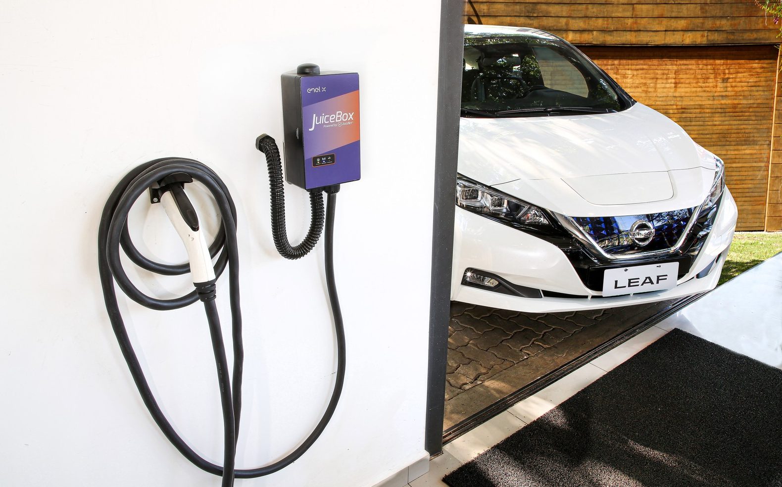 O carregador de parede agora incluso no valor do carro pode ser instalado em casa e demora 8h para recarregar totalmente o modelo. O Leaf ainda vem com um cabo para recarga em tomadas normais, mas o tempo é bem maior: 20h.