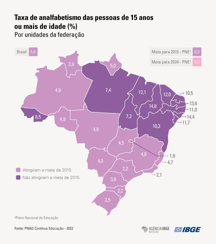 Em Alagoas, a taxa de analfabetismo das pessoas de 15 anos ou mais recuou de 16% em 2019 para 14,4% em 2022, uma redução de pouco mais de 35 mil analfabetos no país, chegando a menor taxa da série, iniciada em 2016. No total, eram 370 mil pessoas que não sabiam ler e escrever no ano passado.