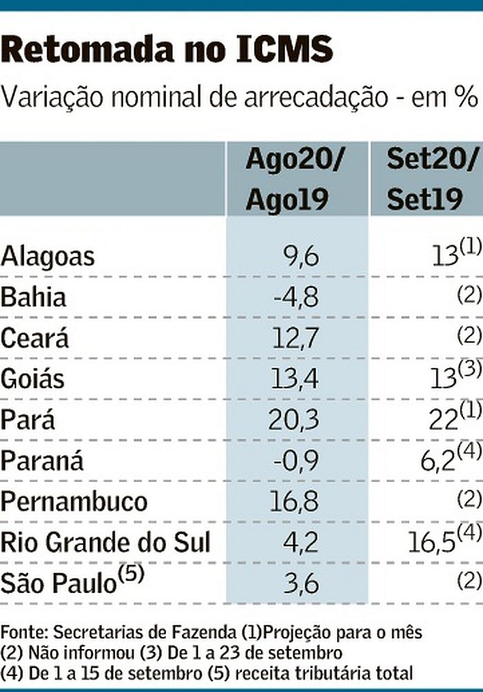 Embalada pela redução das medidas de isolamento e pelo auxílio emergencial, a arrecadação do Imposto sobre Circulação de Mercadorias e Serviços (ICMS) avançou em agosto e também em setembro, segundo dados preliminares de alguns Estados. Em agosto houve crescimento contra igual período de 2019 em São Paulo, Rio Grande do Sul, Pará, Ceará, Pernambuco, Alagoas e Goiás. Em setembro, projeções ou dados parciais em Alagoas, Goiás, Pará, Rio Grande do Sul e Paraná indicam altas nominais que variam de 6,2% a 22% contra mesmo mês de 2019.