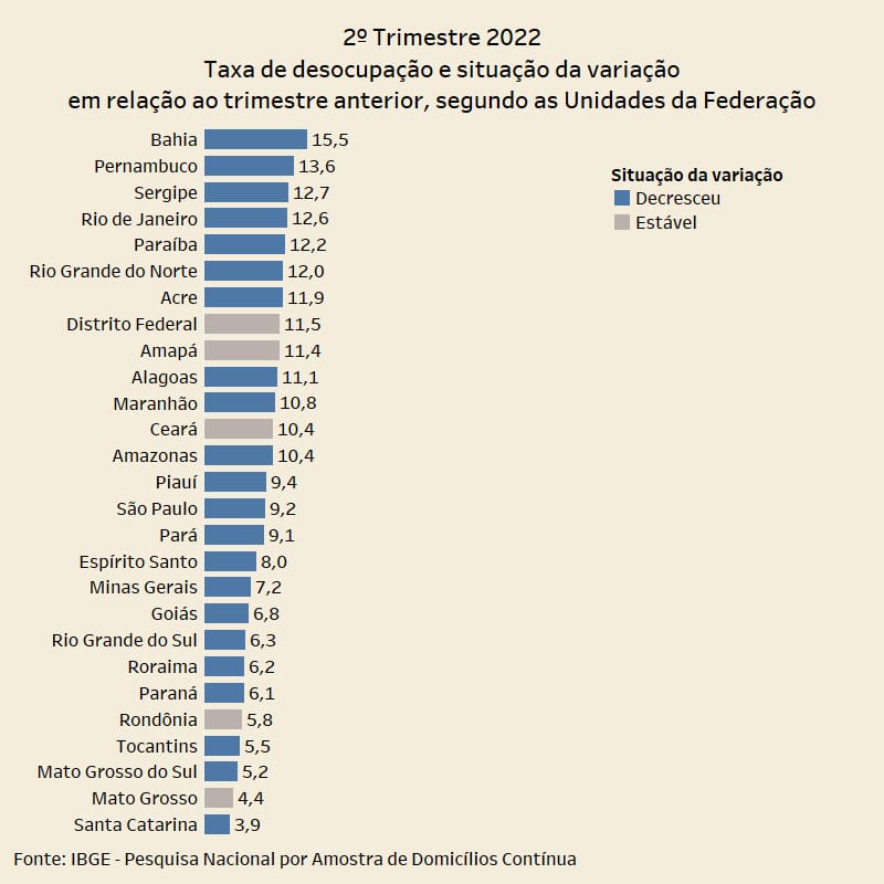 Em números absolutos, o desemprego atingia 149 mil pessoas em Alagoas nos meses de abril, maio e junho, um contingente de 41 mil pessoas a menos na comparação com janeiro, fevereiro e março, quando a desocupação atingia 190 mil pessoas. Em relação ao segundo trimestre de 2021, a queda foi de 41,5%, o equivalente a aproximadamente 106 mil pessoas a menos.