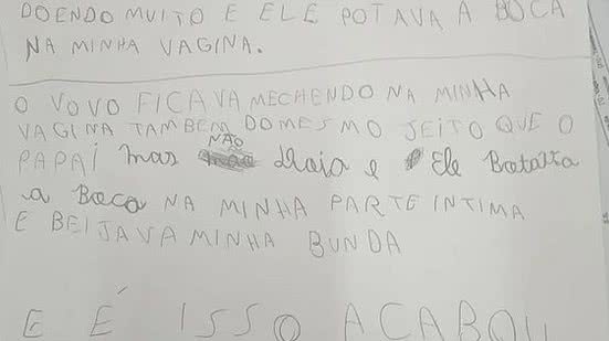 Em uma carta, a menina contou que o pai e o avô colocavam as mãos nas partes íntimas e que abusavam dela. "Doía muito, eu falava para ele, mas ele continuava”, narrou a menina em trecho da carta. A família busca agora por justiça e faz um apelo para que os abusadores sejam presos.
