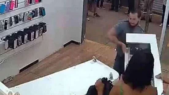 Diante da negativa da loja em devolver o dinheiro, o cliente teve um ataque de fúria e iniciou a destruição do estabelecimento. Conforme as imagens das câmeras de monitoramento interno, após derrubar o primeiro balcão, o homem volta a exigir a devolução do valor pago pelo aparelho.