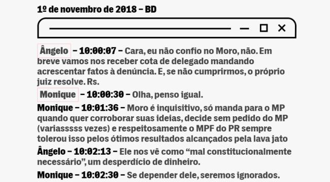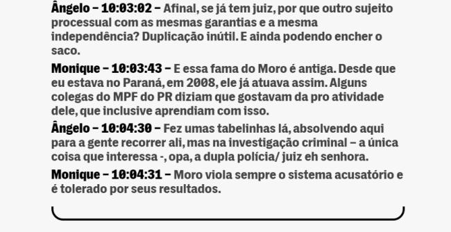 A conversa prossegue: “Afinal, se já tem juiz, por que outro sujeito processual com as mesmas garantias e a mesma independência? Duplificação inútil. E ainda podendo ‘encher o saco'”, reclama Ângelo. Monique diz, em seguida, que “essa fama de Moro é antiga” e explica: “Desde que eu estava no Paraná, em 2008, ele já atuava assim. Alguns colegas do MPF do PR diziam que gostavam da pró-atividade dele, que inclusive aprendiam com isso”.
