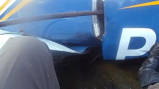 Os policiais usam ferramentas para tentar abrir a porta do avião. Ao conseguir visualizar o interior da aeronave, um dos integrantes da PM diz que viu o antebraço de alguém. Um colega faz uma pergunta que não é possível ouvir no vídeo, mas o policial responde: "está tremendo muito", relata.