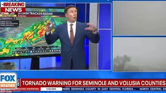 Na última segunda-feira, Brooks Garner, o 'homem do tempo' da emissora da WOFL Fox 35, de Orlando, na Flórida, falava sobre o tornado na região quando percebeu que o prédio do canal estava sendo atingido. "Abriguem-se. Todos no prédio da Fox 35, vão para espaço seguro!", disse ele.