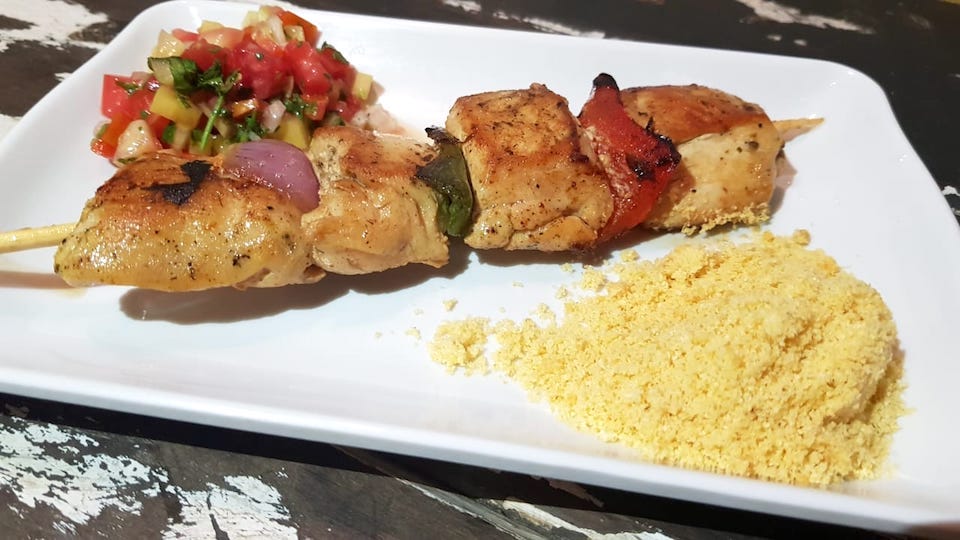 Grelhado: Os famosos espetinhos de “gato” têm assento cativo no boteco nos sabores de frango e de carne intercalados por pimentões coloridos, molho especial e para acompanhar farofa e vinagrete. Pode comer sozinho ou compartilhar.