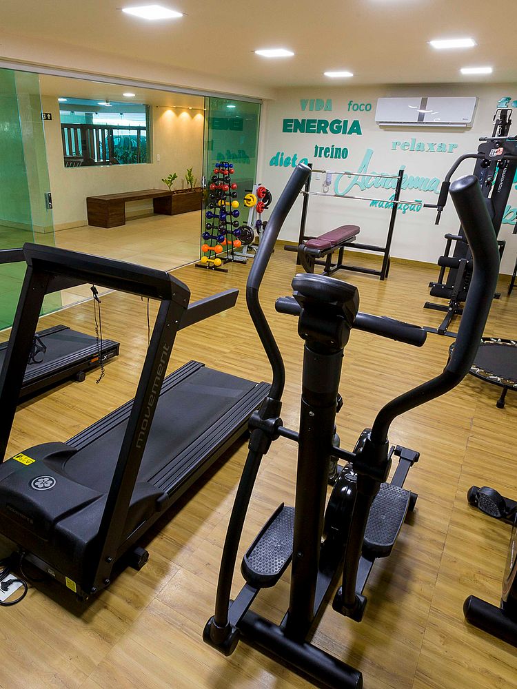 Fitness e recepção decorada tem equipamentos e mobiliário de alto de nível |